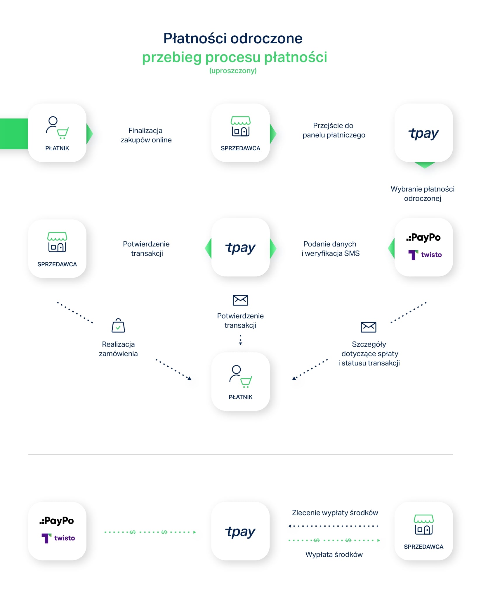 Na grafice powyżej widać uproszczony proces płatności z PayPo i Twisto - w części górnej z perspektywy płatnika, a w części dolnej z perspektywy e-sprzedawcy.