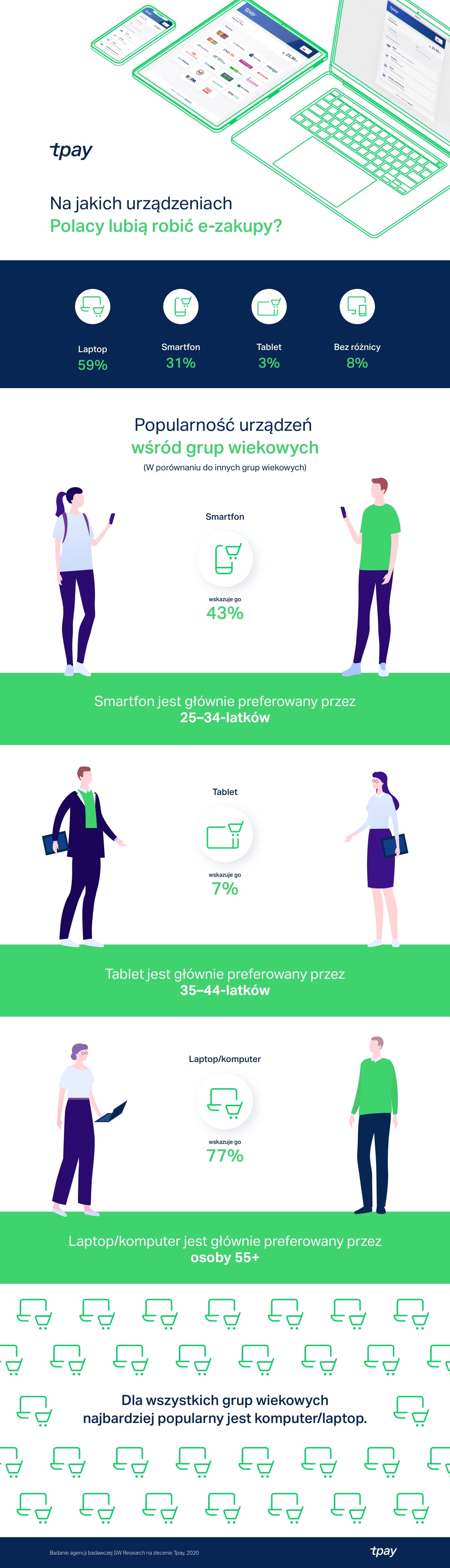Badanie, jakie pod koniec 2020 r. przeprowadziliśmy z agencją badawczą SW Research, nie tylko wskazuje na to, jakie są ulubione metody płatności Polaków. Wiemy również, z jakich najchętniej korzystają urządzeń, by zrobić zakupy w sieci.
